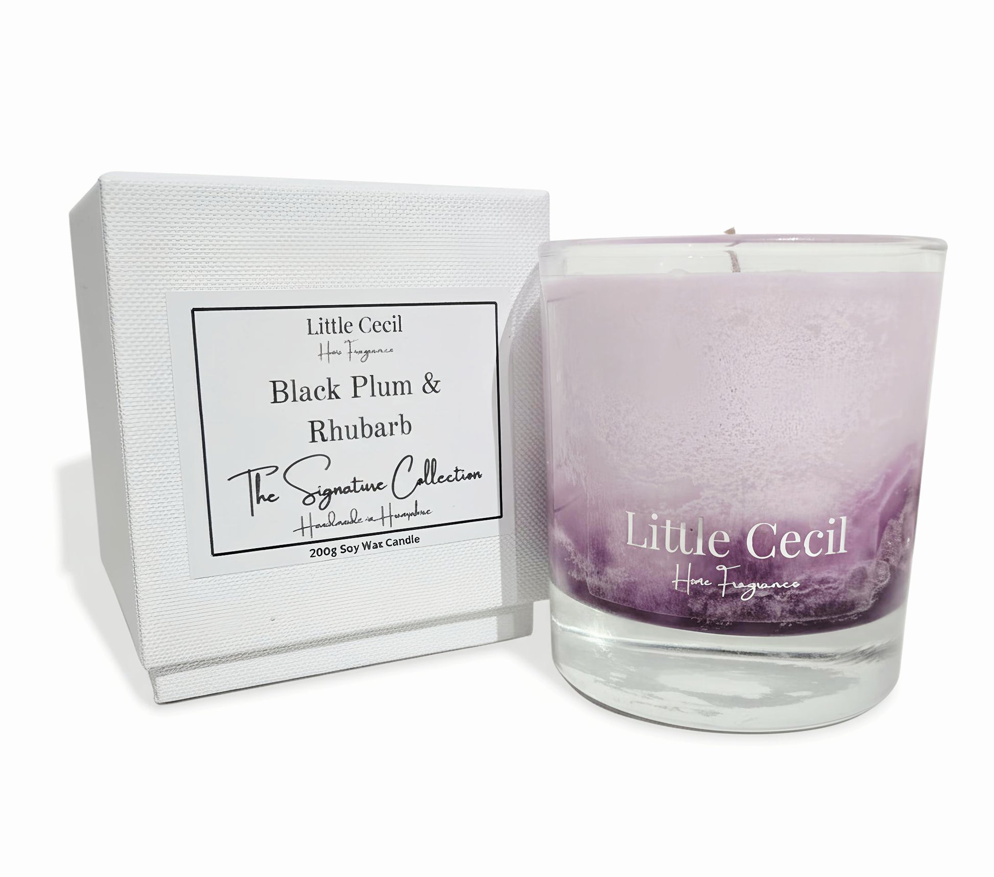 Elevate your space with our Black Plum and rhubarb Signature Candle, a luxurious 200g hand-poured soy candle designed to fill your home with beautiful, long-lasting fragrance.