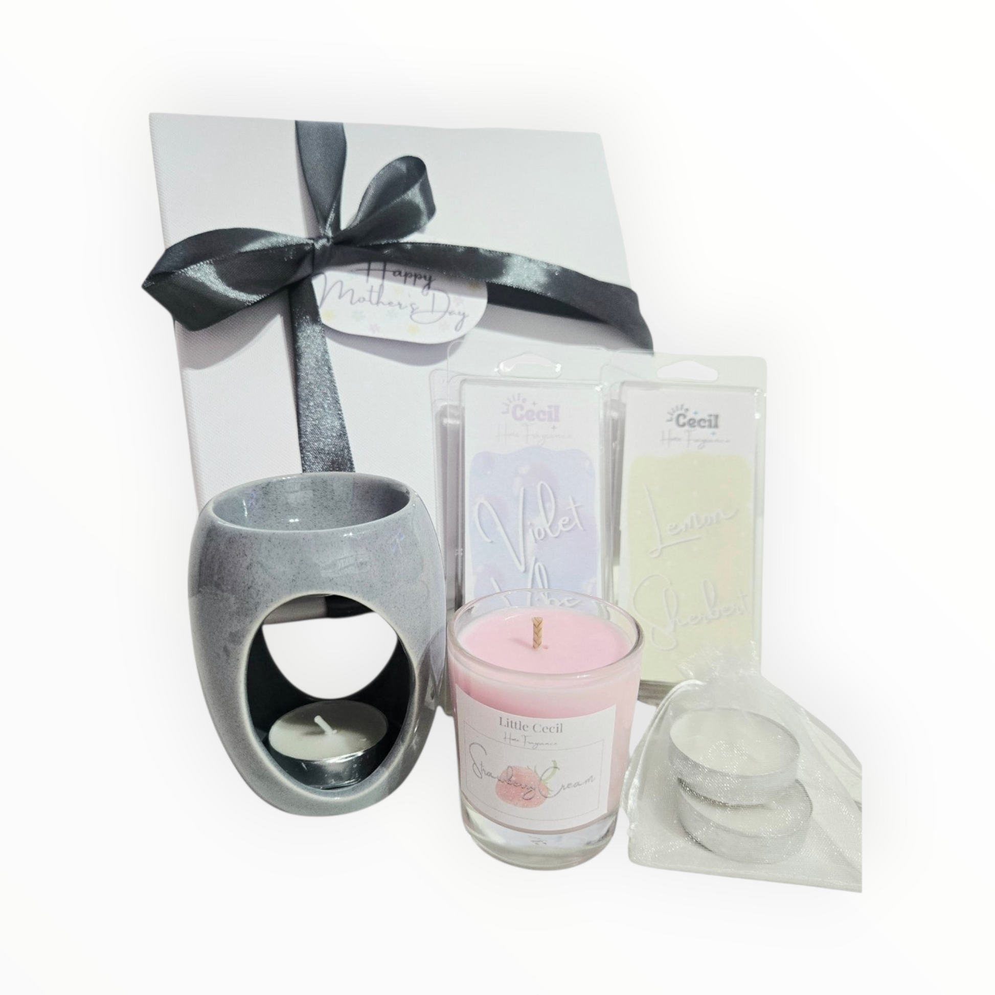 Inside the box: • A stylish ceramic wax burner (available in white or grey) • Two full-size wax melt snap bar in your chosen scent • A mini soy candle • A bag of tealights